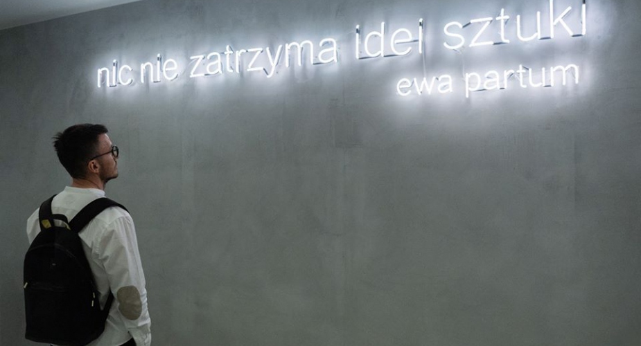 Nawiązujący do twórczości Ewy Partum neon w nowym budynku MS. Fot. www.facebook.com/pg/muzeumsztuki
