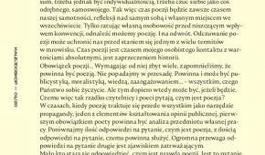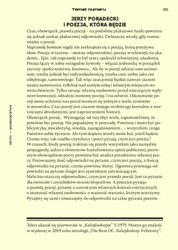 TEMAT NUMERU. Prezentujemy pierwszy duet: poezja - Tomasz Bąk, ilustracja - Michał Arkusiński. Publikujemy także tekst Jerzego Poradeckiego o czasie, obowiązku i prawdzie poezji, zamieszczony na naszych łamach w 1975 roku, który skłonił nas do podjęcia tematu recepcji poezji i poszukiwania utraconej metafory (lub też: sztuki tworzenia i rozumienia metafor)