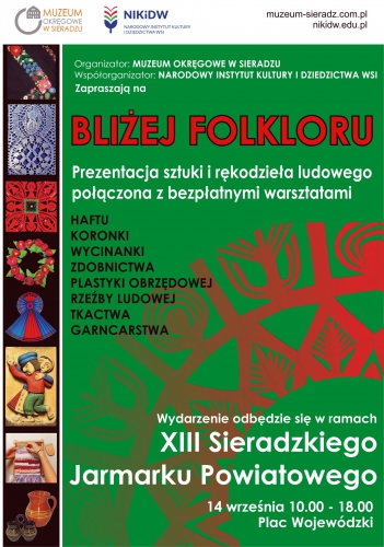 Muzeum Okręgowe w Sieradzu oraz Narodowy Instytut Kultury i Dziedzictwa Wsi zapraszają na „Bliżej folkloru”. Prezentacja sztuki i rękodzieła ludowego połączona z bezpłatnymi warsztatami haftu, koronki, wycinanki, zdobnictwa, plastyki obrzędowej, rzeźby ludowej, tkactwa, garncarstwa oraz koncerty i inne atrakcje. Wydarzenie odbędzie się w ramach XIII Sieradzkiego Jarmarku Powiatowego 14 IX w godzinach 10.00 – 18.00 na Placu Wojewódzkim. Finałem jarmarku będzie koncert zespołu Big Cyc, który zakończy się o godzinie 21.00.