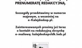 "Kalejdoskop" 04/20 do kupienia w Łódzkim Domu Kultury (w czasie kwarantanny instytucja pozostaje zamknięta dla gości), punktach Ruchu S.A., Kolportera, Garmond-Press w salonach empik i łódzkiej Księgarni Ossolineum (Piotrkowska 181). A także w prenumeracie (w opcji darmowa dostawa do wybranego kiosku Ruchu): TUTAJ