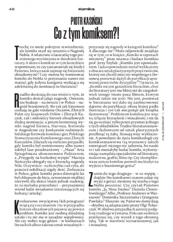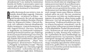 A skoro o komiksie w tym kontekście wspominam, to czy zastanawiali się kiedyś Państwo, która z nauk zajmuje się historiami obrazkowymi?I czy można by nominować komiks do Nobla (o przyznaniu nawet nie marzę), gdy jedyna kategoria wydająca się adekwatną do nominacji to literatura?Rzadko docierają do nas wieści o tym, że komiks dostał jakąś nagrodę. Owszem, nie brakuje – na świecie i w Polsce – nagród branżowych. Bo tak jak kinomani czekają na gale rozdania Oscarów, Złotych Palm czy krajowych Orłów i Złotych Kaczek, tak i miłośnicy historii obrazkowych śledzą nominacje, a potem komentują wyniki nagród Eisnera, Harveya, festiwalu w Angouleme czy konkursów rodzimych: łódzkiego festiwalu komiksu i gier, Polskiego Stowarzyszenia Komiksowego oraz Złotych Kurczaków. Zdarzały się nieliczne przypadki, gdy komiks był nominowany albo nawet zdobył laur pozabranżowy – „Maus” Arta Spiegelmana uhonorowano Pulitzerem, a „Przygody na bezludnej wyspie” Macieja Sieńczyka ubiegały się o literacką nagrodę Nike. Oczywiście – na bezrybiu i rak ryba, ale przecież nobilitacji nigdy dość. Zwłaszcza w Polsce, gdzie komiks przez dziesiątki lat był chłopcem do bicia, synonimem miałkiej rozrywki dla dzieci (mam jednak nadzieję, że to melodia przeszłości – przynajmniej wśród ludzi świadomie interesujących się kulturą i sztuką).