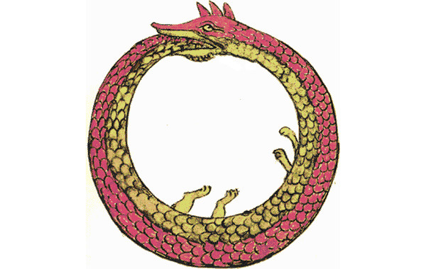 Wyobrażenie uroborosa autorstwa Theodorosa Pelecanosa z 1478 z traktatu alchemicznego...