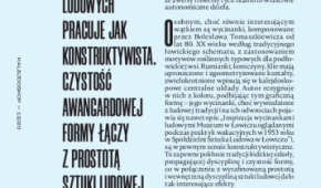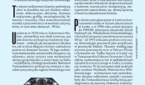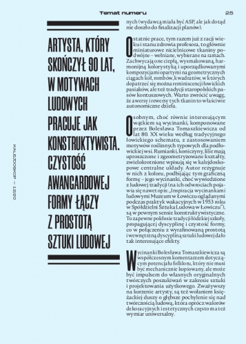 Awangardowy folklor? Tak należałoby nazwać twórczość Bolesława Tomaszkiewicza, jednego z najoryginalniejszych współczesnych polskich artystów-tkaczy, który w świadomy i twórczy sposób czerpie z tradycji swoich rodzinnych stron – z folkloru dawnego Księstwa Łowickiego. To mistrz unikatowej tkaniny podwójnej, choć w dorobku ma też tkaniny odzieżowe, dekoracyjne, obiciowe, dywany, malarstwo, grafikę, metaloplastykę, biżuterię i snycerkę. Owa wszechstronność wynika z pracowitości i otwartości artysty, który w tym roku skończył... 90 lat.