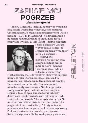 Wiem, że to niefrasobliwe zestawienie, a jednak czytana przeze mnie na nowo i od nowa Ginczanka skojarzyła się z „Historią małżeńską” Noaha Baumbacha, jednym z tych filmowych spełnień ubiegłego roku, które nie ulegną erozji. Skąd ta pewność? Z przekonania, że Baumbach, jak niegdyś Ginczanka, tworzy prawdę. Tworzenie prawdy nie odbiera siły kreacjonizmu. Nie da się przecież sfotografować życia – w kinie, w poezji, nigdzie. Można jednak to życie transmutować tak, żeby drżały nam ręce, błyszczały oczy, żebyśmy patrzyli.