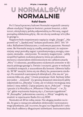 Normalsi od 20 lat robią swoje. Nie ulegają modzie na indie, by grać z rosnącym udziałem elektroniki i syntezatorowego plumkania, jak i na retro, by grać na Organka(ch) i osłabiać słuch odbiorcy długaśnymi solówkami. Instrumentalnie i aranżacyjnie to wciąż polska ekstraklasa: jedna gitara Chypisa wystarcza i – co zaskakuje – nie brakuje wirtuozerii „Konia”. Co jeszcze piszemy o nowej płycie "Wiry"?