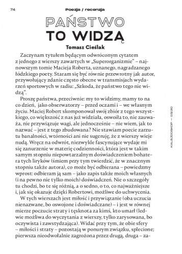Zaczynam tytułem będącym odwróconym cytatem z jednego z wierszy zawartych w „Superorganizmie” – najnowszym tomie Macieja Roberta, uznanego, nagradzanego łódzkiego poety. Staram się być równie przewrotny jak autor, przywołujący zdanie często obecne w transmisjach wydarzeń sportowych w radiu: „Szkoda, że państwo tego nie widzą”. Proszę państwa, przeciwnie: my to widzimy, mamy to na co dzień, jako obserwatorzy – przed oczami i – we własnym życiu.