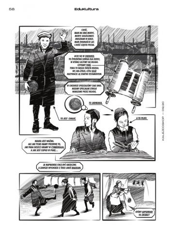 Prezentujemy plansze komiksu Michała Arkusińskiego (rysunek) i Macieja Cholewińskiego (scenariusz), który powstał w ramach ww. projektu realizowanego przez Fundację Monumentum Iudaicum Lodzense dzięki dofinansowaniu z Programu „Ojczysty – dodaj do ulubionych” Narodowego Centrum Kultury.