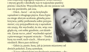 Żyliśmy sobie razem w miarę zgodnie i każdy co jakiś czas, po kryjomu, dzielił się z gołębiem niedojedzoną kanapką, eksmitował za okno pająka, tropił jeża, żeby zobaczyć, dokąd tak po nocy... Czego tu u nas nie było! Trzynogi pies, łysy kot, trójoka wrona, która robiła inspekcję segregacji odpadów. Sroki, szczury i myszy gryzły i dziobały nas w najczulsze punkty piwnic i dachów. Wszystko było, ale nic jeszcze tak nas nie poróżniło, jak ona.