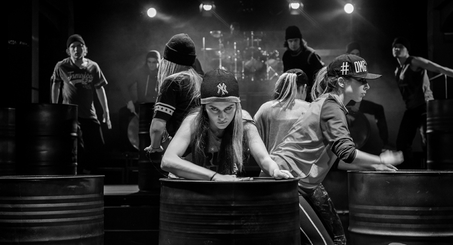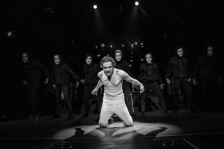 Pierwsze sceny pokazują, jak fascynująca może być praca reżysera, który nie rezygnuje ze wsłuchiwania się w tekst dramatu, nie odrzuca go, ale na różne sposoby otwiera, aktualizuje, przestawia akcenty – jak płodną w sensy czyni to pracę na scenie. Podczas zmiany warty Horacy i jeden ze strażników, w żołnierskich beretach, płaszczach, widzą ducha zmarłego króla, ale podchodzą do niego bez lęku, odbierają jako naturalny fakt. Cóż to za świat, w którym duch władcy uchodzi za „normalność”? Rozmawiają też o „nieszalonym” szaleństwie Hamleta. W tle mają rzędy czarnych beczek oznaczonych czerwonymi trupimi czaszkami. Cokolwiek w nich jest – toksyny, ropa z wyczerpujących się złóż czy ludzka żółć – musi być ważną cechą całego świata scenicznego, skoro staje się częścią komnat królewskiego pałacu. Swoje kwestie para pierwszych postaci prowadzi przy wtórze szybkich jazzujących uderzeń w talerz perkusyjny – buduje to napięcie i wskazuje, że ta interpretacja Szekspira naznaczona będzie silną wizją własną. Mająca cechy swego rodzaju improwizacji będzie się jednak, co wkrótce się potwierdzi, w ramach wyznaczanych przez tekst i ważne dla niego idee.