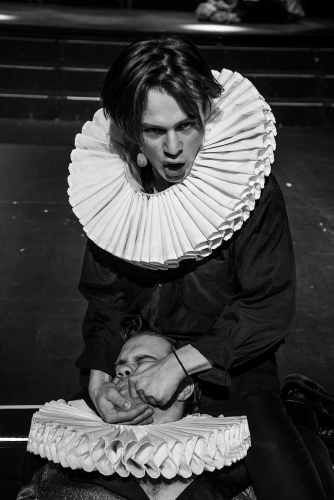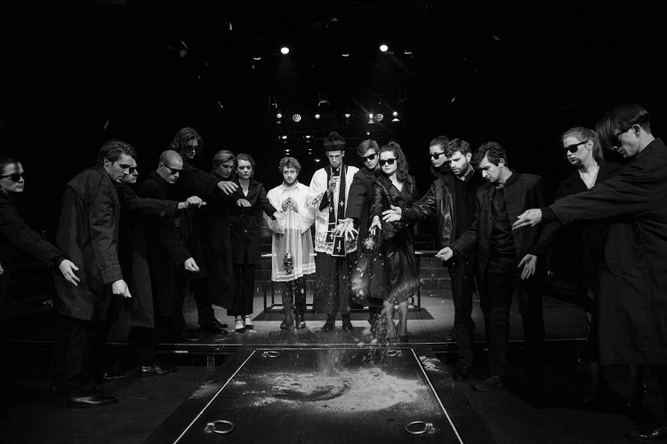 Jak to idzie dalej? Różnie. Laertes zmysłowo całuje Ofelię przed wyjazdem z Danii, co ma sugerować kazirodczą relację (i zepsucie na szczytach władzy). Podobny podtekst może mieć relacja Hamleta z matką. I można powiedzieć: to prosty, znany chwyt. Owszem, ale akceptuje się go, bo jest wpisany w kreślenie ram świata, który wyszedł z formy. I w szerszą grę z tekstem, w którą włączane są niemal wszystkie sceny. Obnażona jest teatralność grobu ojca, przed którym klęka Hamlet – płyta nagrobna to zwykły drewniany podest sceniczny z doczepionymi ad hoc obręczami, której krawędzie oznaczono kredą czy taśmą. Siłowanie się i podnoszenie płyty byłoby pustym, teatralnym, gestem. Gdy zaś Hamlet nie zakłuwa Poloniusza schowanego za kotarą w pokoju matki, tylko rzuca go między rzędy krzeseł po bokach sceny, w miejsce dla widowni spektaklu władzy, i tam tłucze go pięścią na śmierć, to scena ta zostaje z widzem na dłużej – jako prawdziwa właśnie, nie „teatralna”, bo podyktowana tekstem (który jest "strażnikiem" teatrem władzy).