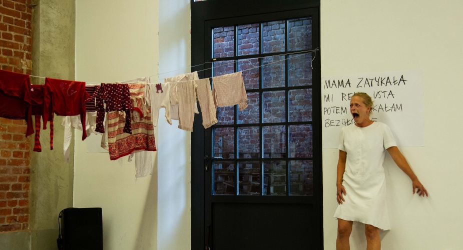 I słusznie, bo spektakle popołudniowe nie były przeznaczone dla dziecięcego ucha i dziecięcej wrażliwości. „Akty” performerki Aurory Lubos to bezkompromisowy spektakl o aktach przemocy domowej wobec kobiet i dzieci, o wstydzie, destrukcji i cierpieniu, jakie ze sobą niosą. Przedstawienie powstało na kanwie historii, które wydarzyły się naprawdę, i zostały powierzone twórczyni przedstawienia podczas licznych spotkań warsztatowych z kobietami w ośrodkach pomocy dla kobiet. Przedstawienie zbudowane zostało z kilku mocnych cytatów pisanych na ścianach, z białego kręgu materiału z równie przejmującymi napisami – wspomnieniami, który zamienił się w szczelnie opinającą spódnicę, ciągnącą się do ziemi niczym pancerz, uniemożliwiając aktorce wykonanie jakiegokolwiek ruchu. Obrazowe skojarzenie z Wenus Boticellego, piękną, długowłosą i z białą muszlą u stóp, uprawnione jak najbardziej, tyle że na zasadzie kontrastu, tu wszelkie nadzieje są zawiedzione, a kobiecość znieważona i podeptana. Ważnym tematem jest też cisza. Cisza na widowni, cisza wokół tematu przemocy, tuszowanie niewygodnej prawdy. Tuszowanie przez trudne, ale jednak możliwe przekroczenie przez widzów kobiety w progu – aktorki, leżącej pośród potłuczonych talerzy. Tuszowanie poprzez poranny makijaż wykonywany jakby nigdy nic, wieszanie wypranych dziecięcych ubranek, założenie szpilek i podawanie gościom wódki, ciasta z kremem i truskawkami, jakby nic się nie stało. Przełknąć to ciastko ciężko, a jednak przełykamy. Mamy ochotę krzyknąć i wyjść, ale nie wychodzimy, symbolicznie uwięzieni w kręgu przemocy, wraz z aktorką w środku. I, cytując Tomasza Rodowicza z Teatru Chorea, celebrujemy to, czego nie powinniśmy celebrować. Wieńczący spektakl cytat z projekcji „Mamo, ja ci pomogę – uratujemy razem świat”, wygłaszany przez małą dziewczynkę, brzmi rozbrajająco, a zarazem gorzko. Podobnie jak ciekawa pospektaklowa dyskusja dotycząca między innymi tego, na ile można kogokolwiek uratować i czy teatr choć trochę zmienia świat na lepsze.