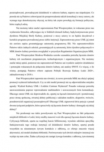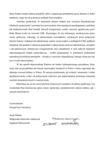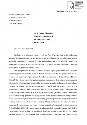 Miejska Strefa Kultury. Tak ma nazywać się nowa instytucja kultury łódzkiego samorządu. Powstanie przez połączenie pięciu domów kultury, z których każdy ma swoją historię, specyfikę działalności, kadrę, osadzony jest w innym otoczeniu i z nim kooperuje. W miejsce Bałuckiego Ośrodka Kultury, Centrum Kultury Młodych, Ośrodka Kultury „Górna”, Poleskiego Ośrodka Sztuki oraz Widzewskich Domów Kultury ma powstać Miejska Strefa Kultury w Łodzi.Przeciw takiemu działaniu łódzkiego magistratu protestowali od wielu miesięcy pracownicy domów kultury i niektórzy ich dyrektorzy, a ich kampanię „Stop centralizacji kultury” wsparli m.in. aktorzy Jan Peszek i Mariusz Saniternik, wokalistka Iza Połońska, pisarze Jacek Dehnel i Zygmunt Miłoszewski reprezentujący Unię Literacką (należą do niej też m.in. noblistka Olga Tokarczuk i Dorota Masłowska), pisarka Sylwia Chutnik. Do dialogu nawoływali wykładowcy Uniwersytety Łódzkiego – szefowie katedr Instytutu Kultury Współczesnej oraz dziekan Wydziału Filologicznego. Wskazywano też na negatywne skutki takiego rozwiązania, brak dialogu ze strony władz Łodzi i precedensowy charakter działań, na który będą mogły powoływać się inne samorządy, gdyby chciały łączyć swoje instytucje. Interpelacje i apele wysłały do prezydent Łodzi także posłanki Hanna Gill-Piątek (Polska 2050), Paulina Matysiak i Daria Gosek-Popiołek (Lewica).