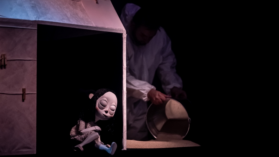 Nabu jako lalka to głównie głowa i nogi. Głowa nieco za duża, ale dobrze widoczna, gdy podczas animacji oddaje szereg towarzyszących dziewczynce emocji. I nogi – bo Nabu wędruje. Przez nie wypowiada się na scenie ponoszony przez dziecko trud. Cel całej animacji – nawiązać relację między dziewczynką a widzem. Tylko wtedy można odczarować, w sobie przede wszystkim, to, co postrzegane jest jako obcość.Nie jest trudno zinstrumentalizować ten temat. Łatwo też opis „Wędrówki Nabu” przykroić do „odpowiedniej” tezy i linii. Zakrzyczeć, innym zamykając usta. Uczynić niebudzącym wątpliwości. Wtedy niepotrzebny jest teatr. Wystarczy gazetowy papier, w który można opakować „mojsze” świata widzenie, internetowy ściek ludowych mądrości, klikający się tytuł, koniecznie z galerią. I pokłady świętego oburzenia. A Nabu jest sympatyczna. Ma duże czarne oczy i odstające uszy, delikatne dłonie i stopy, różowe poliki i drobne, jakby zaciśnięte usta. Cieszy się z małych rzeczy, ale nie robi tego często. Raczej nie jest wesoła. Powodów ma ku temu wiele. Dom jej rodziny płonie. Dwukrotnie. Dlaczego, Nabu nie wie. Są jacyś dorośli, którzy toczą swoje sprawy. A potem domu nie ma. Zawsze są jacyś dorośli. Dlaczego odbierają jej dom, Nabu nie rozumie. Ucieka więc „z domu, którego nie było” i chce dojść, dopłynąć tam, gdzie domy są solidne i nie palą się, a dorośli pilnują nie tylko swoich spraw, ale także dobra dzieci.