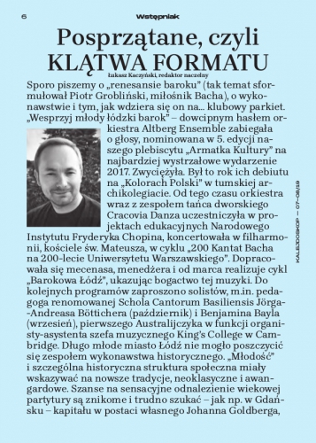 Wstępniak pochodzi z numeru lipcowo-sierpniowego „Kalejdoskopu” 07-08/19, którego tematem jest "Renesans baroku". Pismo do kupienia w Łódzkim Domu Kultury, punktach Ruchu S.A., Kolportera, Garmond-Press i salonach empik. A także w prenumeracie (w opcji darmowa dostawa do wybranego kiosku Ruchu): TUTAJ. Nie możesz kupić "Kalejdoskopu" w swojej okolic? Napisz na kalejdoskop@ldk,lodz.pl, spróbujemy rozwiązać ten problem.