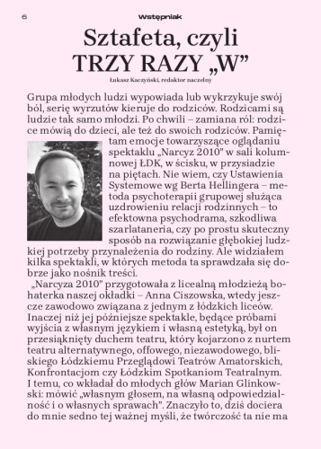 Grupa młodych ludzi wypowiada lub wykrzykuje swój ból, serię wyrzutów kieruje do rodziców. Rodzicami są ludzie tak samo młodzi. Po chwili – zamiana ról: rodzice mówią do dzieci, ale też do swoich rodziców. Pamiętam emocje towarzyszące oglądaniu spektaklu „Narcyz 2010” w sali kolumnowej ŁDK, w ścisku, w przysiadzie na piętach. Nie wiem, czy Ustawienia Systemowe wg Berta Hellingera – metoda psychoterapii grupowej służąca uzdrowieniu relacji rodzinnych – to efektowna psychodrama, szkodliwa szarlataneria, czy po prostu skuteczny sposób na rozwiązanie głębokiej ludzkiej potrzeby przynależenia do rodziny. Ale widziałem kilka spektakli, w których metoda ta sprawdzała się dobrze jako nośnik treści.„Narcyza 2010” przygotowała z licealną młodzieżą bohaterka naszej okładki – Anna Ciszowska, wtedy jeszcze zawodowo związana z jednym z łódzkich liceów. Inaczej niż jej późniejsze spektakle, będące próbami wyjścia z własnym językiem i własną estetyką, był on przesiąknięty duchem teatru, który kojarzono z nurtem teatru alternatywnego, offowego, niezawodowego, bliskiego Łódzkiemu Przeglądowi Teatrów Amatorskich, Konfrontacjom czy Łódzkim Spotkaniom Teatralnym. I temu, co wkładał do młodych głów Marian Glinkowski: mówić „własnym głosem, na własną odpowiedzialność i o własnych sprawach”. Znaczyło to, dziś dociera do mnie sedno tej ważnej myśli, że twórczość ta nie ma pretensji, by być „pięknym” teatrem. Ale to teatr dostarcza narzędzi, by, ucząc się mówić o tym, co mnie dotyczy, doświadczać, budować relacje i ukonstytuować się jako osoba wobec innych i świata. Myślenie to było, dziś coraz częściej to widzę, niezwykle wywrotowe. Zwłaszcza jeśli na gigantyczną pracę Mariana Glinkowskiego spojrzymy z dzisiejszej perspektywy – odczuwając perswazyjne przekonanie o „obowiązkach” kultury (np. jej udziale w PKB) czy wobec „producenckiego” myślenia o działalności instytucji artystycznych (tyle a tyle wydarzeń, które będą miały „zasięg”). Myślę o tym, co Marian Glinkowski osiągnął nawet nie jako animator i organizator ŁST, ale jako ten, wokół którego orbitowali edukatorzy, instruktorzy teatralni, w ogóle ludzie światem jako takim zainteresowani; jako ten, który zapraszany był do jury i kapituł przeglądów i festiwali. I co dawał innym, choćby rozmowami. Osadzona w instytucji (ŁDK) działalność ta była zgoła nie-instytucjonalna, jeśli pod pojęciem "instytucji" zamkniemy wszystko, co kojarzy się ze sztampą, biurokracją, jakośtobędzizmem.