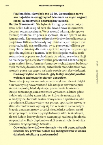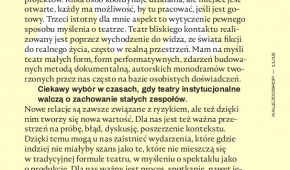 Paulina Ilska: Szwalnia ma 10 lat. Co uważasz za wasze największe osiągnięcie? Nie mam na myśli nagród, raczej subiektywnie postrzegany sukces.Marcin Brzozowski: Nie było nic i z tego powstało coś, co trwa 10 lat. Udało się od zera zbudować nowe miejsce z zapleczem organizacyjnym. Wypracować własną, nietypową formułę działania. To praca zespołowa, ale nie oparta na stałym zespole. Zapraszamy różnych twórców do realizowania projektów. Kilka osób koordynuje działania, ale miejsce jest otwarte, każdy ma możliwość, by tu pracować, jeśli jest gotowy. Trzeci istotny dla mnie aspekt to wytyczenie pewnego sposobu myślenia o teatrze. Teatr bliskiego kontaktu realizowany jest poprzez wychodzenie do widza, ze świata fikcji do realnego życia, często w realną przestrzeń. Mam na myśli teatr małych form, form performatywnych, zdarzeń budowanych metodą dokumentalną, autorskich monodramów tworzonych przez nas często na bazie osobistych doświadczeń.