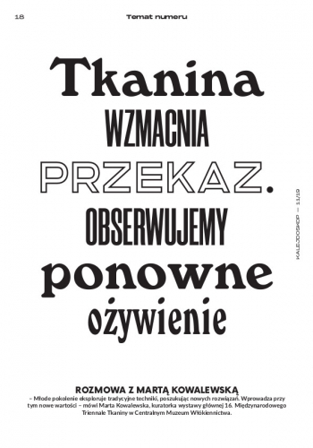 TEMAT NUMERU. – Młode pokolenie eksploruje tradycyjne techniki, poszukując nowych rozwiązań. Wprowadza przy tym nowe wartości – mówi w rozmowie z Aleksandrą Talagą-Nowacką Marta Kowalewska, kuratorka wystawy głównej 16. Międzynarodowego Triennale Tkaniny w Centralnym Muzeum Włókiennictwa.
