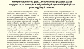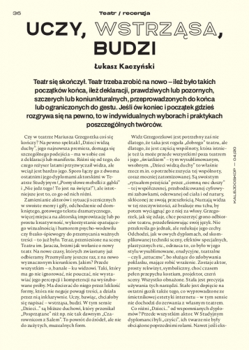 Czy w teatrze Mariusza Grzegorzka coś się kończy? Na pewno spektakl „Dzieci widzą duchy”, jego najnowsza premiera, domaga się szczególnego podejścia – ma w sobie coś z deklaracji lub manifestu. Spektakl ten różni się od tego, do czego reżyser latami przyzwyczaił widza, ale wciąż jest bardzo jego. Sporo łączy go z dwoma ostatnimi jego dyplomami aktorskimi w Teatrze Studyjnym („Pomysłowe mebelki z gąbki” i „Nie jedz tego! To jest na święta!”), ale istotniejsze jest to, co go od nich różni.Zamienianie aktorów i sytuacji scenicznych w swoiste memy i gify, odchodzenie od dotkniętego, gotowego tekstu dramatycznego, więcej miejsca na aktorską improwizację lub po prostu kreatywność, wykorzystanie epatującego wizualnością i humorem psycho-wodewilu czy freako-śpiewogry do przemycania ważnych treści – to już było. Teraz, przeniesione na scenę Teatru im. Jaracza, brzmi jak wołanie o nowy teatr. Na nowe czasy, których zwiastuny już odbieramy. Przemyślany jeszcze raz, z na nowo wyznaczonym kierunkiem. Jakim? Przede wszystkim – o, banale – ku widzowi. Taki, który ma go nie ignorować, nie pouczać, nie wystawiać jego percepcji i kompetencji na wyśrubowane próby. Ma docierać do niego przez lekkość formy, która nie neguje powagi treści, a działa przez nią inkluzywnie. Uczy, bawiąc, chciałoby się napisać – wstrząsa, budzi. W tym sensie „Dzieci...” są bliższe duchowi, który przenikał „Posprzątane” niż np. nie tak dawnym „Czarownicom z Salem”. To powrót do źródeł, ale nie do zużytych, muzealnych form.