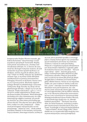 – Tam jest super zakręt – mówi – świetnie grają szyny. Jadący tramwaj brzmi jakby odzywał się jakiś zwariowany saksofon. Wnętrze przychodni przy Leczniczej ma niezwykłą akustykę dzięki okrągłej klatce schodowej. Jest kanał Dętka, gdzie robiłem koncert. Natura to też wspaniałe źródło, ale coraz trudniej w okolicy Łodzi znaleźć „czyste”, naturalne otoczenie dźwiękowe. Mieszkam teraz pod Strykowem, ale i tam dociera szum autostrady. Nawet gdy jesteśmy w Lesie Łagiewnickim, jeśli się dobrze wsłuchamy, w tle usłyszymy jednostajny szum miasta. Suavas Lewy uczestniczył w warsztatach deep listening prowadzonych przez Pauline Oliveros, co skierowało jego uwagę m.in. na „dźwięki ludzkich przemyśleń” – słuchanie znaczenia słów, ale także brzmienia, artykulacji, przebiegów intonacyjnych, dynamicznych, frazy, harmonii. To pomogło w relacjach międzyludzkich – lepiej rozumieć, słyszeć drugą osobę. Uświadomiło mu, że wypowiedzi ludzi mogą być tworzywem muzycznym, narracją kompozycji.[…]