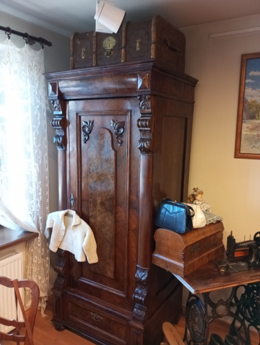 Podobnie jak piękna dziewiętnastowieczna garderobiana szafa, zbudowana bez jednego gwoździa. Gdy trafiła do muzeum, była pomalowana brązową farbą olejną. – Byliśmy przekonani, że nie da się uratować mebla, ale gdy zobaczył go specjalista, zachwycił się, że poprzedni użytkownik nie nasączył go czymś, nie zeszlifował, a jedynie powierzchownie zniszczył mebel – opowiada pani Lidia.