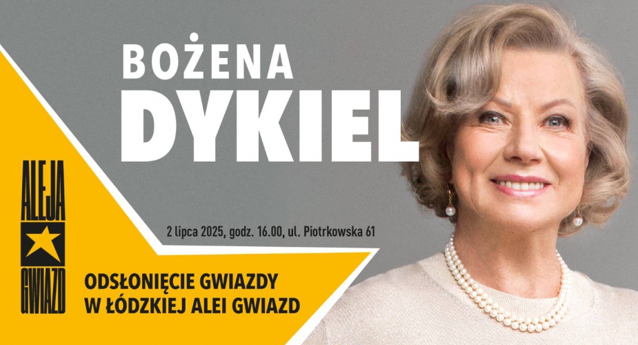 Bożena Dykiel, jednej z najpopularniejszych i najbardziej charakterystycznych aktorek teatru, kina i telewizji, 2 lipca o godzinie 16 w Łódzkiej Alei Gwiazd przy ul. Piotrkowskiej 61 odsłoni swoją gwiazdę. Aktorka olśniewa zarówno rolą Mady Müller w „Ziemi obiecanej”, jak i Jadwigi Kolędy w „Wyjściu awaryjnym”. Pracowała z największymi twórcami polskiego teatru i kina – Adamem Hanuszkiewiczem i Andrzejem Wajdą. Zagrała w 130 filmach, serialach i spektaklach telewizyjnych.