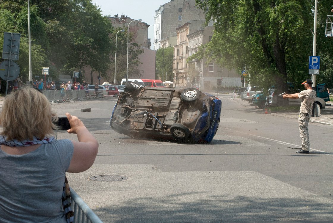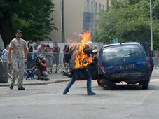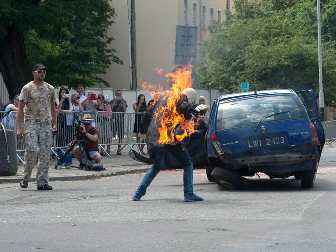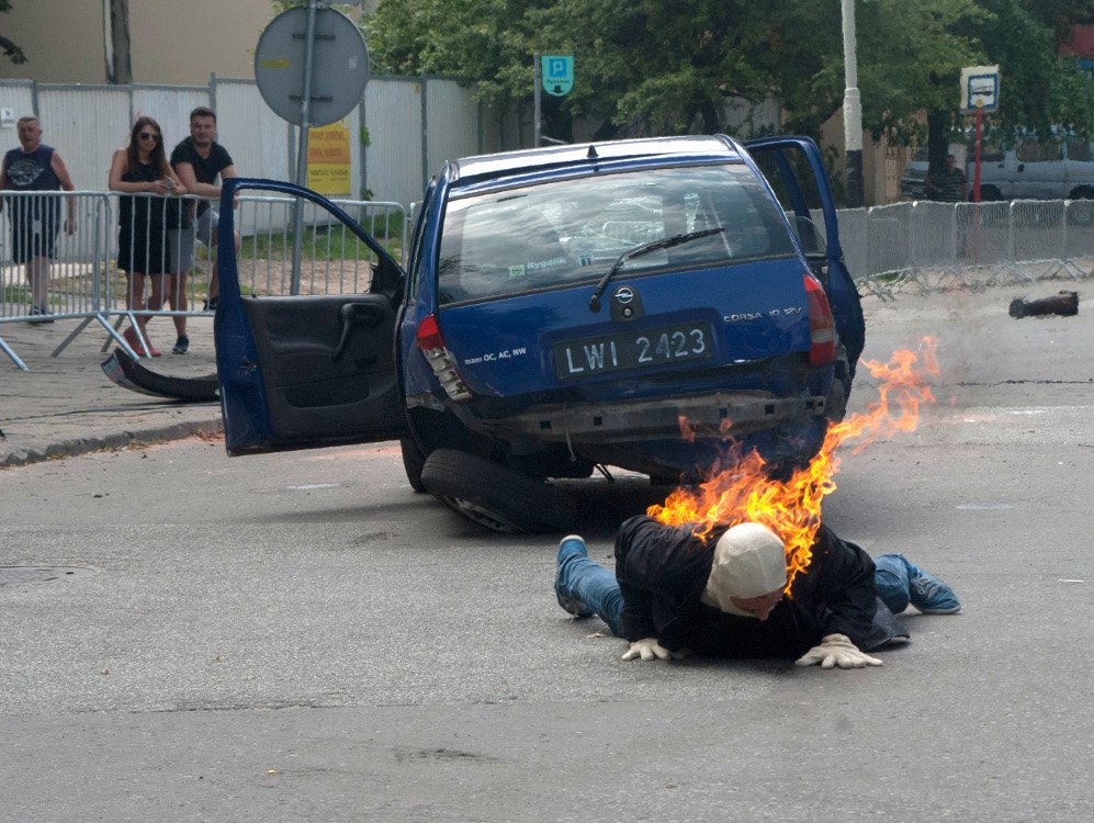 koziołkujący w powietrzu samochód oraz płonący człowiek. W ten