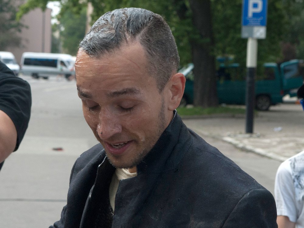 poparzeniami (twarz i odzież pokryta jest tajemniczą miksturą