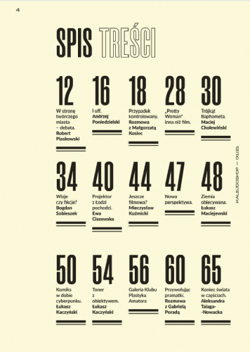 * W zakładce ARCHIWUM naszego portalu znajdziecie już dostępne w PDF-ie wybrane artykuły tego NUMERU do przeczytania m.in. "Jeszcze filmowa?" Mieczysława Kuźmickiego, "Przywołując pramatki" - rozmowę Joanny Glinkowskiej z Gabrielą Poradą, oraz zajawki innych, w tym "Wizji czy fikcji?" Bogdana Sobieszka , czyli resume filmowości Łodzi oraz rozmowy miesiąca Piotra Groblińskiego z Małgorzatą Kosiec, której obrazy możecie oglądać na okładce oraz wewnątrz numeru.