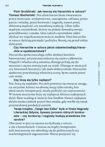 Piotr Grobliński: Jak tworzą się hierarchie w sztuce?Tomasz Bocheński: Nie ufam hierarchiom tworzonym przez instytucje, wydawnictwa, czasopisma, reklamę, przez partie i władzę, przez festiwale i nagrody, nawet przez zbiorową mądrość czy narodową tradycję. Ufam tylko mądrym czytelnikom, którzy na piśmie dowodzą swojej przenikliwości i smaku. Głos takich czytelników słabo słychać we współczesnym świecie mediów. Dziś hierarchie w sztuce dyktują pieniądz i polityka. Bronię się przed takim dyktatem.