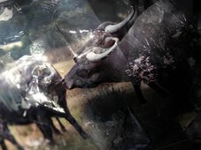 kapelusz, wielkie kolczyki w uchu. Bawoły, owce, snopki, polna
