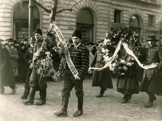 Zdjęcie zostało wykonane 9 grudnia 1925 roku w Warszawie podczas pogrzebu Władysława Stanisława Reymonta. Na pierwszym planie dwuosobowa delegacja z Charłupi Wielkiej niesie wieniec z napisem na szarfie: „Swemu przyjacielowi chłopi z sieradzkiego”.