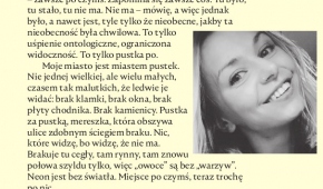 Smak na końcu języka, słowo z tyłu głowy, cień oderwany od przedmiotu. Zapomnienie jest jak ślad – zawsze po czymś. Zapomina się zawsze coś. Tu było, tu stało, tu nie ma. Nie ma – mówię, a więc jednak było, a nawet jest, tyle tylko że nieobecne, jakby ta nieobecność była chwilowa. To tylko uśpienie ontologiczne, ograniczona widoczność. To tylko pustka po. Moje miasto jest miastem pustek. Nie jednej wielkiej, ale wielu małych, czasem tak malutkich, że ledwie je widać: brak klamki, brak okna, brak płyty chodnika. Brak kamienicy. Pustka za pustką, mereszka, która obszywa ulice zdobnym ściegiem braku. Nic, które widzę, bo widzę, że nie ma. Brakuje tu cegły, tam rynny, tam znowu połowa szyldu tylko, więc „owoce” są bez „warzyw”. Neon jest bez światła. Miejsce po czymś, teraz trochę po nic.