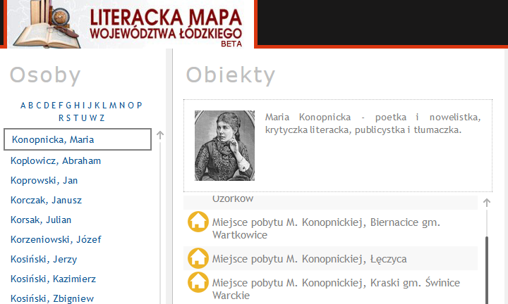 Literacka Mapa Województwa Łódzkiego tworzona jest w Dziale Zbiorów Regionalnych Wojewódzkiej Biblioteki Publicznej im. Marszałka J. Piłsudskiego w Łodzi: region@wbp.lodz.pl / 42 663 03 23