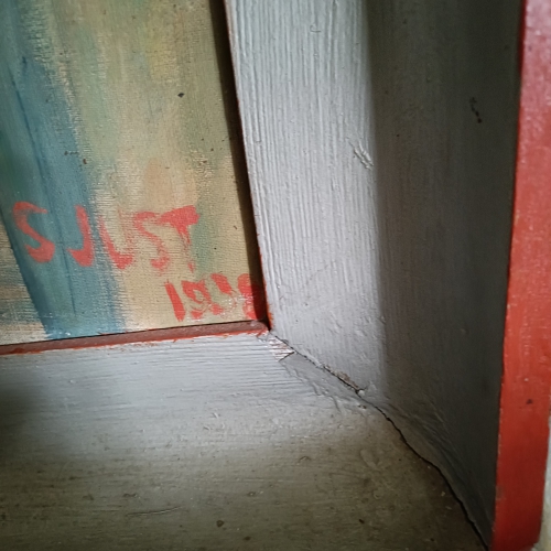 Obraz na płótnie o wymiarach 130 x 100 cm, najprawdopodobniej zaraz po namalowaniu, został oprawiony w drewnianą ramę pomalowaną na szary kolor. Na odwrocie ramy jest podpis artysty: S Just. Teraz „Kobieta w kapeluszu” jest przygotowywana do renowacji.