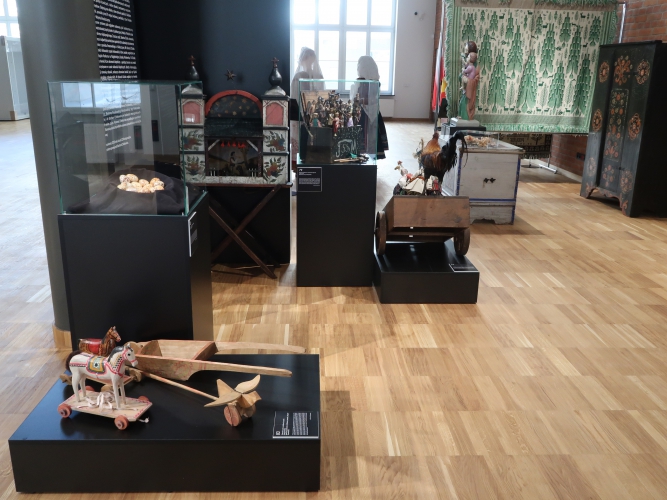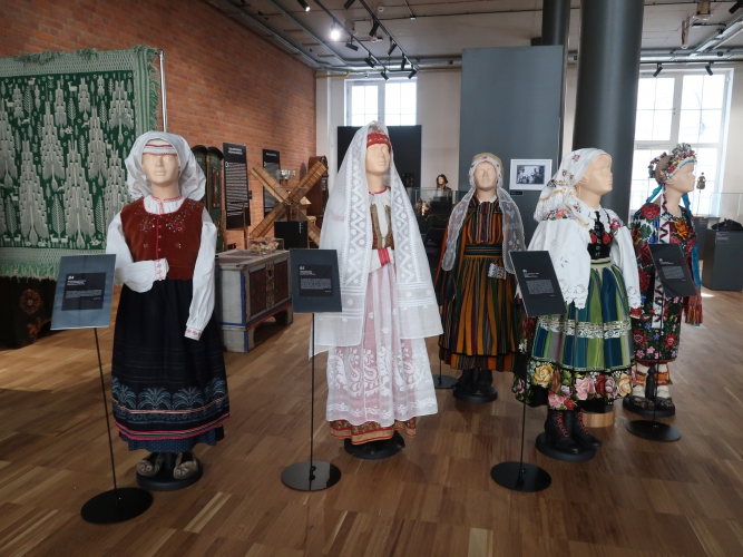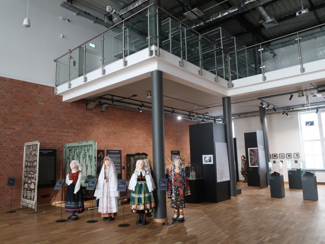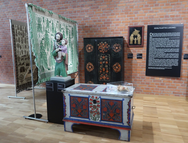 Z innych działów pochodzą malowane szafy z XVIII wieku, łowicka skrzynia z 1911 roku, batikowe pisanki z Huculszczyzny i stroje ludowe – w tym łemkowski ubiór kobiecy z przełomu XIX i XX wieku, pozyskany w 1947 r. bezpośrednio po wysiedleńczej akcji „Wisła”, oraz raczej nietypowy – bo w całości zdobiony błyszczącymi koralikami – współczesny kobiecy ślubny strój huculski.