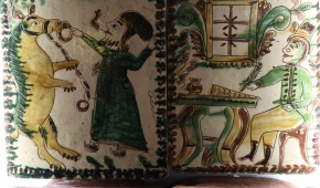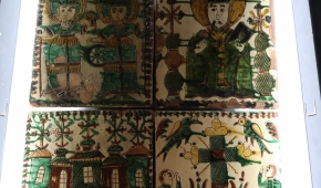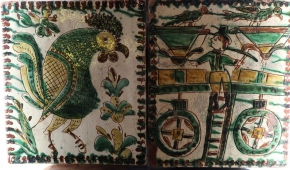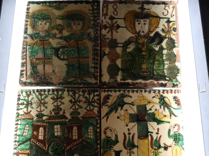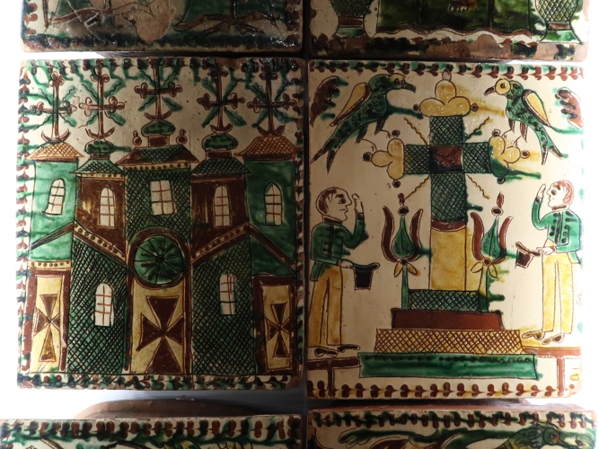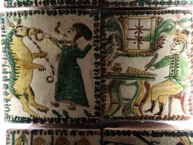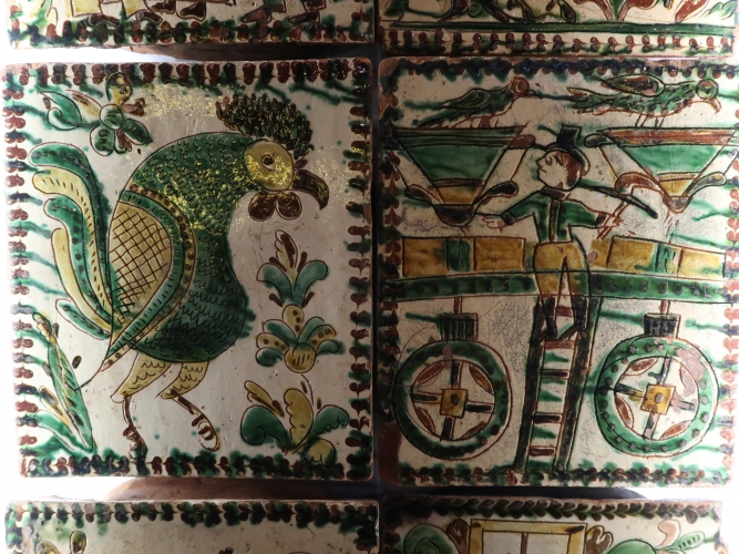 Zaskoczyły mnie niezwykłe kafle, od których trudno oderwać wzrok – każdy przedstawia inną scenę lub widok w zielono-brązowo-żółtej kolorystyce.