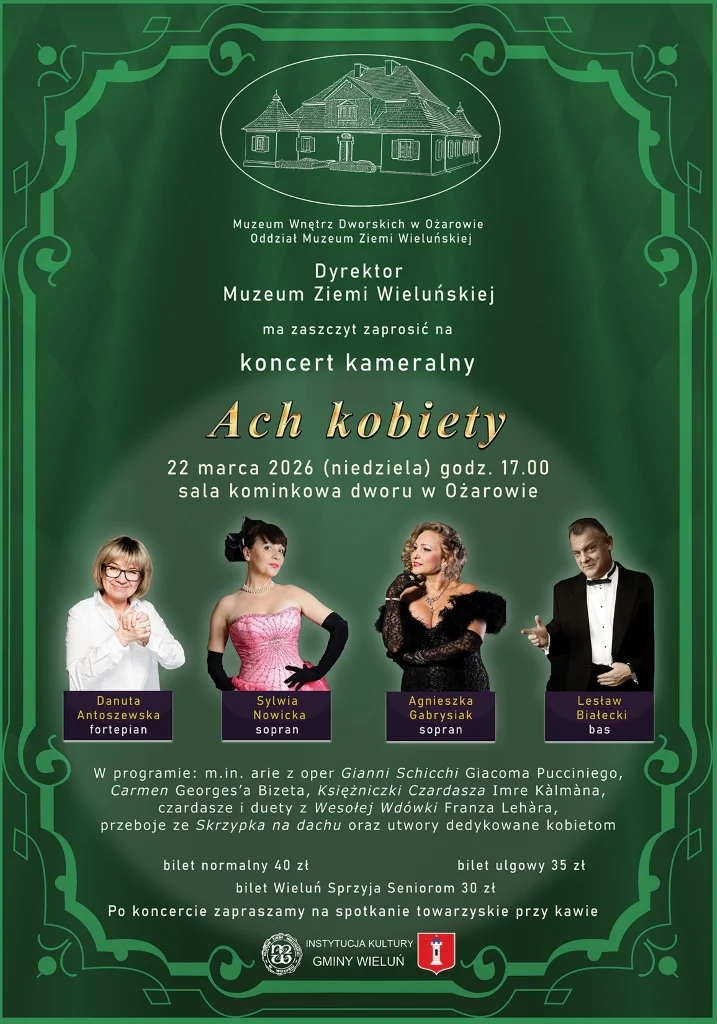 Muzeum Ziemi Wieluńskiej zaprasza 22 III na koncert do dworu w Ożarowie na koncert „Ach kobiety”. W programie są arie operowe i operetkowe oraz wielkie przeboje musicalowe i rozrywkowe. Początek wydarzenia o godzinie 17.00.