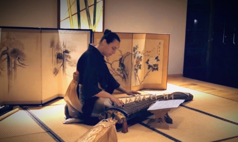 Na ścianie obok innych instrumentów wisi w gotowości do gry japońskie yakumogoto – specyficzna cytra używana w liturgii shinto w kulcie animistycznym. Nazwa oznacza dosłownie „cytra ośmiu chmur”. Ma dwie jedwabne struny: białą i turkusową oraz maleńkie progi, a raczej prożki w kształcie kropek i maleńkich ptaszków wykonanych z kości. Do gry zakłada się duży, kościany walec (rokan) na środkowy palec lewej ręki, którym gra się podobnie jak na hawajskiej gitarze. Na palcu wskazującym prawej ręki znajduje się duży kościany pierścień-plektron, też służący do szarpania jedwabnych strun.