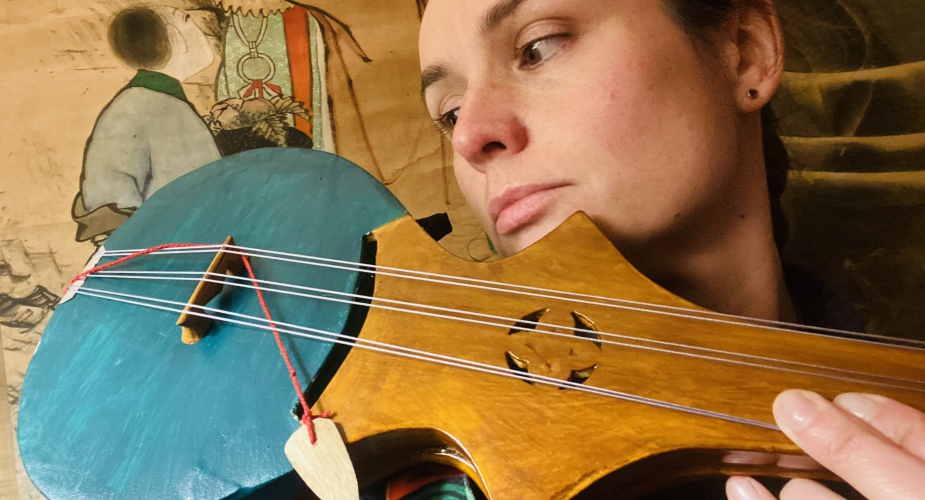 Właścicielka erhu robi kilka ruchów smyczkiem i słychać rżenie koni.