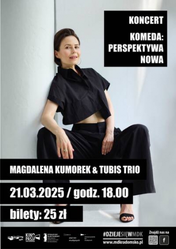 Miejski Dom Kultury w Radomsku zaprasza 21 III na koncert pod tytułem „Komeda: Perspektywa Nowa. Wystąpi Magdalena Kumorek z zespołem Tubis Trio. Bilety w cenie 25 złotych. Początek koncertu o godzinie 18.00.