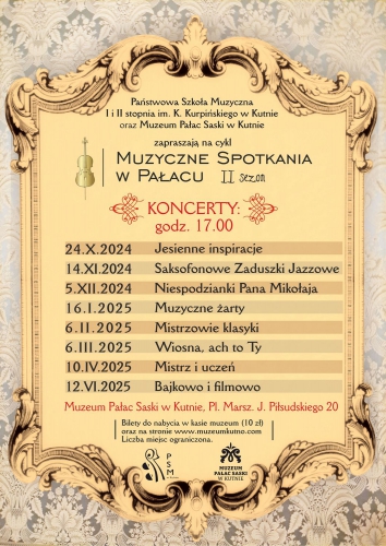 Muzeum Pałac Saski w Kutnie i Państwowa Szkoła Muzyczna I i II stopnia w Kutnie zapraszają na cykl koncertowy pt.: “Muzyczne Spotkania w Pałacu – II sezon”.