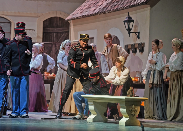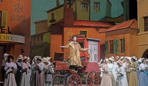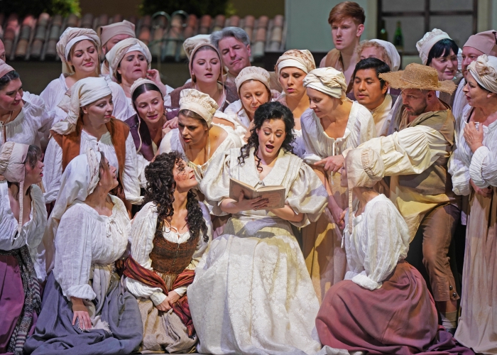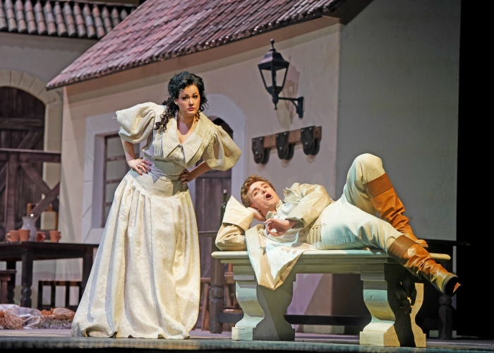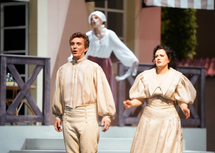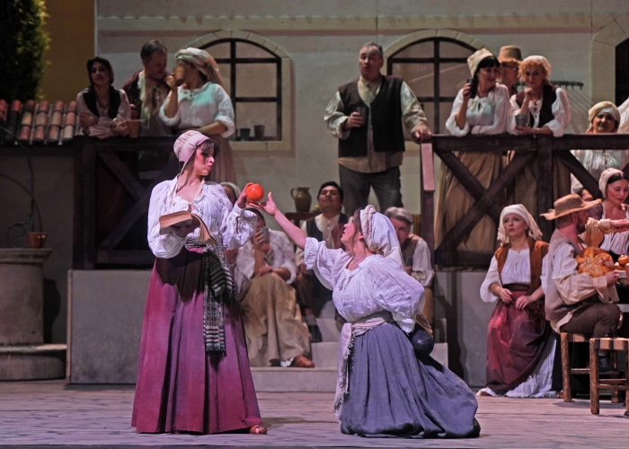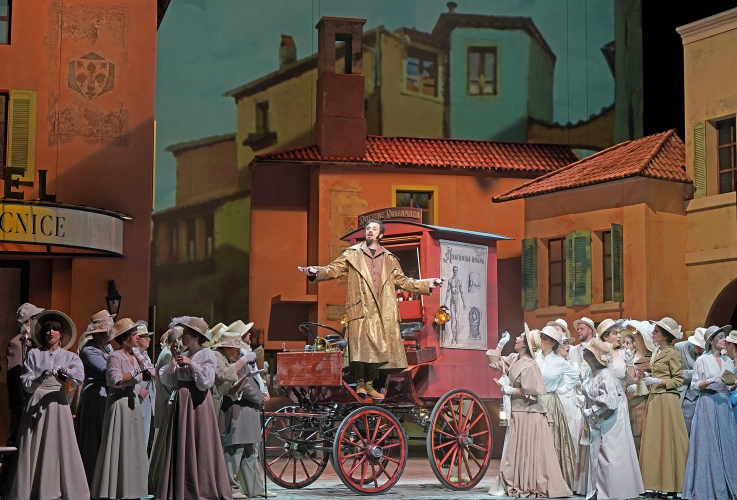 Najlepiej wypadła warstwa wizualna przedstawienia, która – choć może kojarzyć się z przedstawieniami operowymi trzeciej ćwiartki ubiegłego wieku – jest spójna estetycznie i kolorystycznie. Scenograf Marek Chowaniec przyznaje się do inspiracji włoskimi pejzażami oraz XIX-wiecznym malarstwem krajobrazowym Johna Constable’a. Stworzył więc tradycyjny, ale miły dla oka obraz toskańskiej wsi i miasteczka (tylko dlaczego horyzont cały czas przesuwał się względem nieruchomych dekoracji?). Malarstwem rodzajowym inspirowała się projektantka kostiumów Maria Balcerek, dbając o dopasowanie strojów do dekoracji.