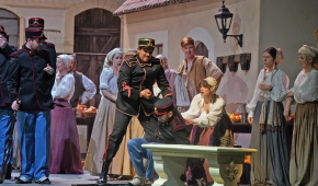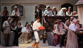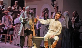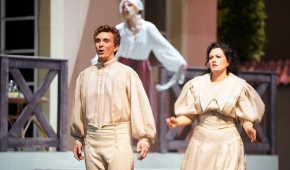 Choć partytura zawiera sceny zbiorowe, „Napój miłosny” to w znacznej części opera o kameralnym charakterze: wiele scen przeznaczonych jest dla jednego lub dwojga solistów. To jest ten moment, w którym precyzja sopranu koloraturowego (Adina) i liryzm aksamitnego tenoru (Nemorino) mogą zabrzmieć najpełniej. Jednocześnie warto obsadzić w głównych rolach artystów młodych, którzy podarują bohaterom niepodrabialną świeżość, bezpretensjonalność i entuzjazm. Nic dziwnego, że spełnienie wszystkich tych warunków często nie jest możliwe. Łódzka inscenizacja pozwoliła cieszyć się młodzieńczym wdziękiem i zaangażowaniem Aleksandry Borkiewicz-Cłapińskiej i Krzysztofa Lachmana, ale na pełnię ich głosowych możliwości trzeba jeszcze chwilę poczekać. Młody tenor po niefortunnej pierwszej scenie odnalazł panowanie nad głosem. Ostrożnie podszedł do legendarnej arii „Una furtiva lagrima”, nie dając się zwieść jej pozornej, zdradzieckiej prostocie. Wzruszeń artystycznych nie dostarczył widzom Armando Pina w roli sierżanta Belcore (nic dziwnego, że Adina w końcu go rzuciła). Najwięcej autentycznych emocji i prawdziwego dowcipu – o ironio! – miał w zanadrzu ten, kto wedle libretta był największym oszustem: handlujący „cudownym” napojem miłosnym Dulcamara. W tej roli Daniel Mirosław zebrał gorące i w pełni zasłużone brawa.