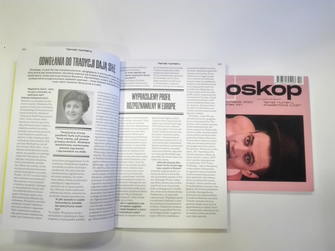 Magdalena Sasin: Jakie ma pani priorytety na najbliższe lata?Elżbieta Aleksandrowicz: Stawiam na umiędzynarodowienie uczelni. Akademia Muzyczna w Łodzi jest członkiem Europejskiego Stowarzyszenia Konserwatoriów, Akademii i Wyższych Szkół Muzycznych (AEC), które zrzesza wiele instytucji, również spoza Europy. Stowarzyszenie wspiera międzynarodowe kontakty, pomaga wypracować pomysły na prowadzenie uczelni muzycznej. Z idei i inspiracji AEC realizujemy dwa projekty. Pop and Jazz Platform ma się odbyć w lutym 2021 roku – w zależności od możliwości stacjonarnie, na zasadzie streamingu online lub hybrydowo. Kierunek jazz i muzyka estradowa, który prowadzimy od kilku lat, dobrze się rozwija, cieszy się dużym zainteresowaniem wśród kandydatów na studia. Projekt „10+10” to z kolei dziesięć wydarzeń artystycznych lub naukowo-artystycznych w łódzkiej Akademii i dziesięć w Hochschule für Musik und Darstellende Kunst w Stuttgarcie. Pierwszy panel z muzyką kameralną odbędzie się niebawem. Planujemy również warsztaty muzyki współczesnej oraz wokalne i organowe. Takie wydarzenia inspirują całą społeczność akademicką, także tych, którzy nie są bezpośrednio zaangażowani w ich realizację. Działalność międzynarodowa to także wymiana studentów. Na razie została z konieczności ograniczona, ale mam nadzieję, że niebawem odżyje. Nowe możliwości współpracy zagranicznej ujawniły się w czasie pandemii. Obecnie wiele wydarzeń odbywa się online, również na poziomie międzynarodowym.