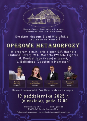 Muzeum Ziemi Wieluńskiej zaprasza 19 X do Muzeum Wnętrz Dworskich w Ożarowie na koncert pod tytułem „Operowe metamorfozy”.