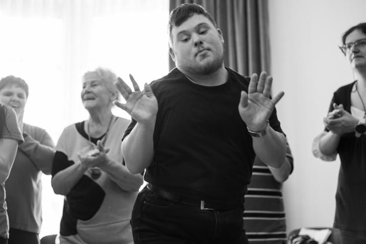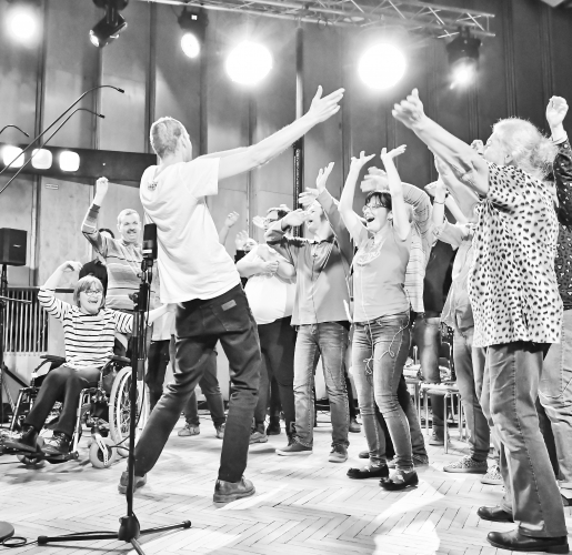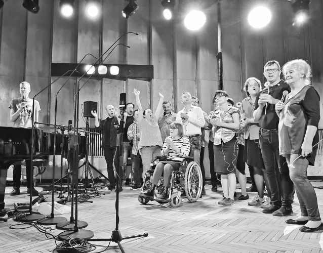 Takiego chóru na pewno nie ma. Na całym świecie nie ma takiego projektu! [śmiech]. W zajęciach Warsztatów Terapii Zajęciowej Spółdzielni ОRPEL uczestniczy około dwudziestu osób. Spośród nich zebrała się grupa takich, które chcą śpiewać, i tę grupę prowadzi Grażyna Walkowska. Nasz projekt to było dla nich pierwsze zetknięcie z bardziej abstrakcyjną formą śpiewu.