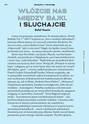 Coma nie przestaje zaskakiwać. Po świeżej, nowoczesnej i nowomodnej płycie „Metal Ballads Vol. 1” (2017) wypuszcza „Sen o siedmiu szklankach”, koncept album oparty na coverach utworów dla dzieci, ze szczególnym uwzględnieniem tych z filmów o Panu Kleksie. Szata graficzna okładki, pełna nadziei w soczystych zieleniach, mówi natomiast wprost: wracamy do lasu narobić wyrafinowanego hałasu. A echo na to: to możliwe. Ale będą się czepiać. Powraca temat „starej dobrej Comy”, która skończyła się na „Hipertrofii”. Jaki to ma sens? Nigdy nie będzie starej Comy, ponieważ jest nowa – na miarę naszych czasów i możliwości.Sześć razy Pan Kleks, raz Jacek i Placek, raz Pan Samochodzik, raz przybysze z Matplanety, raz Coma kolektywnie i sześć razy „indywidualnie”. Tak w uproszczeniu prezentuje się zawartość „Snu o siedmiu szklankach” (nie licząc remiksu „Przybyszów”). Wędrówka po meandrach dzieciństwa zaczyna się dość ostro. Wstęp do „Witajcie w naszej bajce” odegrany jest w stylu hard, choć nie stroni od wielu innych dźwięków „post-”, o które zadbał producent i klawiszowiec Paweł Cieślak (niezmiennie Hasselhoff Studio). Klimat oryginału, zresztą jak w przypadku wszystkich cudzych kompozycji na tej płycie, został zachowany. Choć najbardziej chyba w „Wędrówce” i „Z pamiętnika młodego zielarza”, w których Piotr Rogucki przekonywająco wpisuje się w maniery wokalne Janusza Panasewicza i Piotra Fronczewskiego, jednocześnie korzystając z właściwych sobie barw.