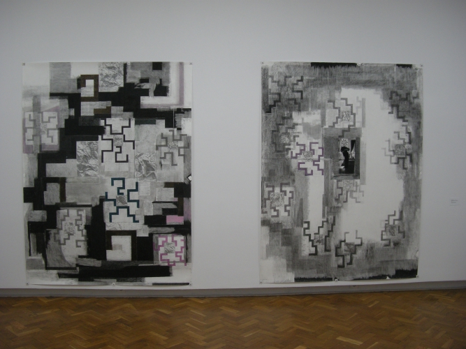 Inny element, który pojawia się w różnych miejscach, to łamana mocna czarna linia kojarząca się ze swastyką. O tym, że takie skojarzenie jest uprawnione, świadczy szkicownik, w którym Marek Chlanda rysuje m.in. owe ornamenty i odręcznie dopisuje „antysemita to chój / antysemita to chuj / antysemita to chój, antysemita to huj”. I znów emocje w abstrakcyjnym i, wydawałoby się, beznamiętnym kształcie.
