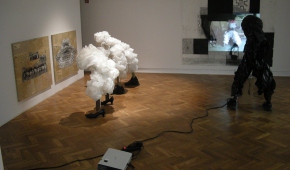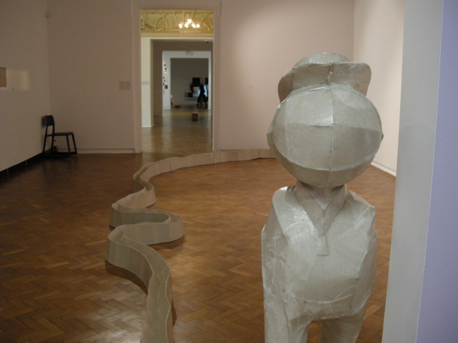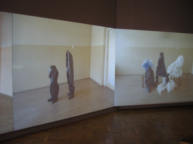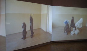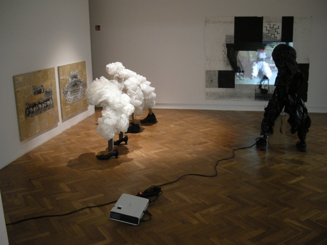 Bo złożona, konceptualna sztuka krakowskiego twórcy urodzonego w 1954 roku, prezentowana na wystawie w ms1, może być dla wielu odkryciem. Tu rysunek jest obiektem, instalacja rysunkiem, rzeźba też nie jest po prostu rzeźbą. Mocny jest już początek wystawy – zajmująca cały pokój instalacja „Studium posłuszeństwa” z 2018 roku, która dała tytuł całej prezentacji, niepokoi i zaciekawia zarazem. Oto białe pręty wygięte na kształt nóg, które są obute, stąpają w obrębie wyznaczonej deskami granicy. Efekt oświetlenia sztucznym światłem w ciemnym pomieszczeniu (do tego z zabytkowym pałacowym wystrojem) sprawia, że instalacja staje się oderwanym od rzeczywistości muzealnym obiektem – zapewne zupełnie inaczej wygląda w świetle dziennym, a jeszcze inne znaczenie zyskałaby, postawiona np. na ulicy. Trudno powiedzieć, czy taki sposób prezentacji dodaje czy ujmuje jej treści. Niemniej, wymowa o ryzach, w jakich udaje się nas usadowić, o tym, jak prężnie i giętko wędrujemy po ścieżkach, jakie nam wyznaczono, dobrze wybrzmiewa. Te fantomy, niekiedy ubrane we wdzianka z foliowych worków, wprawione w ruch w poklatkowych animacjach, krocząc czy tańcząc „budują” między sobą relacje. W innej sali oglądamy rodzajowe scenki z ich udziałem, gdzie fantomy naśladują ludzkie uczucia.