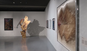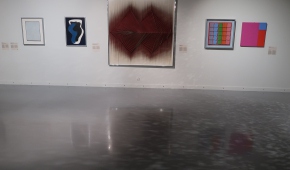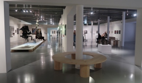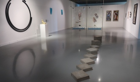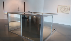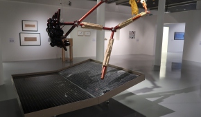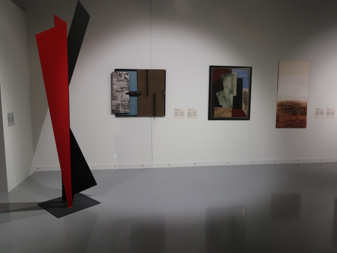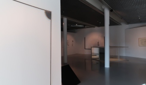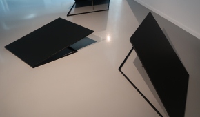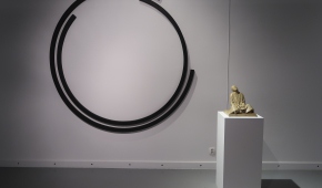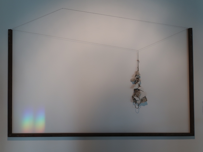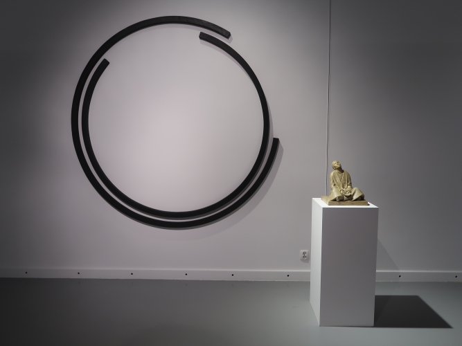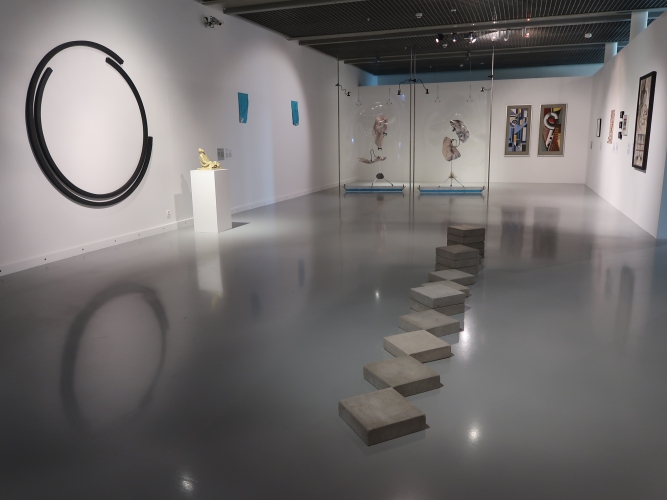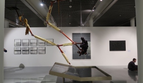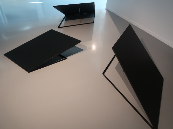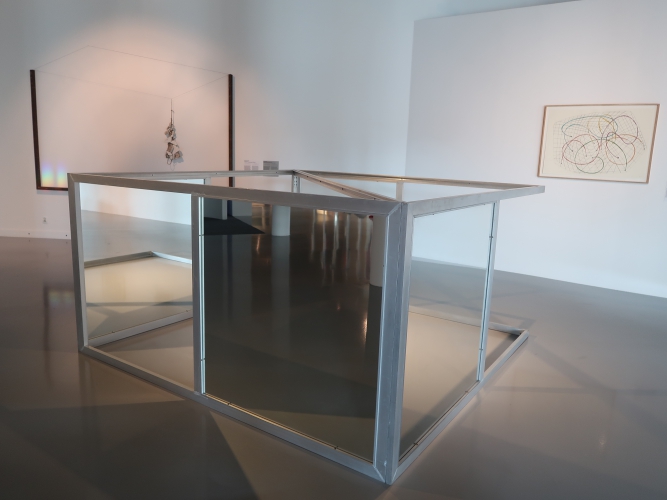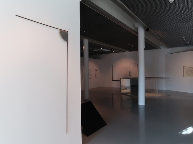 minimalistyczny obiekt Kojiego Kamojiego „Księżyc” z lat 1994–95 (dwa stykające się pod kątem prostym metalowe pręty połączone kawałkiem błyszczącej, zaokrąglonej blachy) powtarza zarazem formę kąta tworzonego przez ścianę i sufit oraz kształt przejścia między ścianą i kolumną. Równie minimalistyczny szereg płyt chodnikowych Petera Lowe z 1981 roku staje się optycznym traktem prowadzącym ku dalszej części wystawy.
